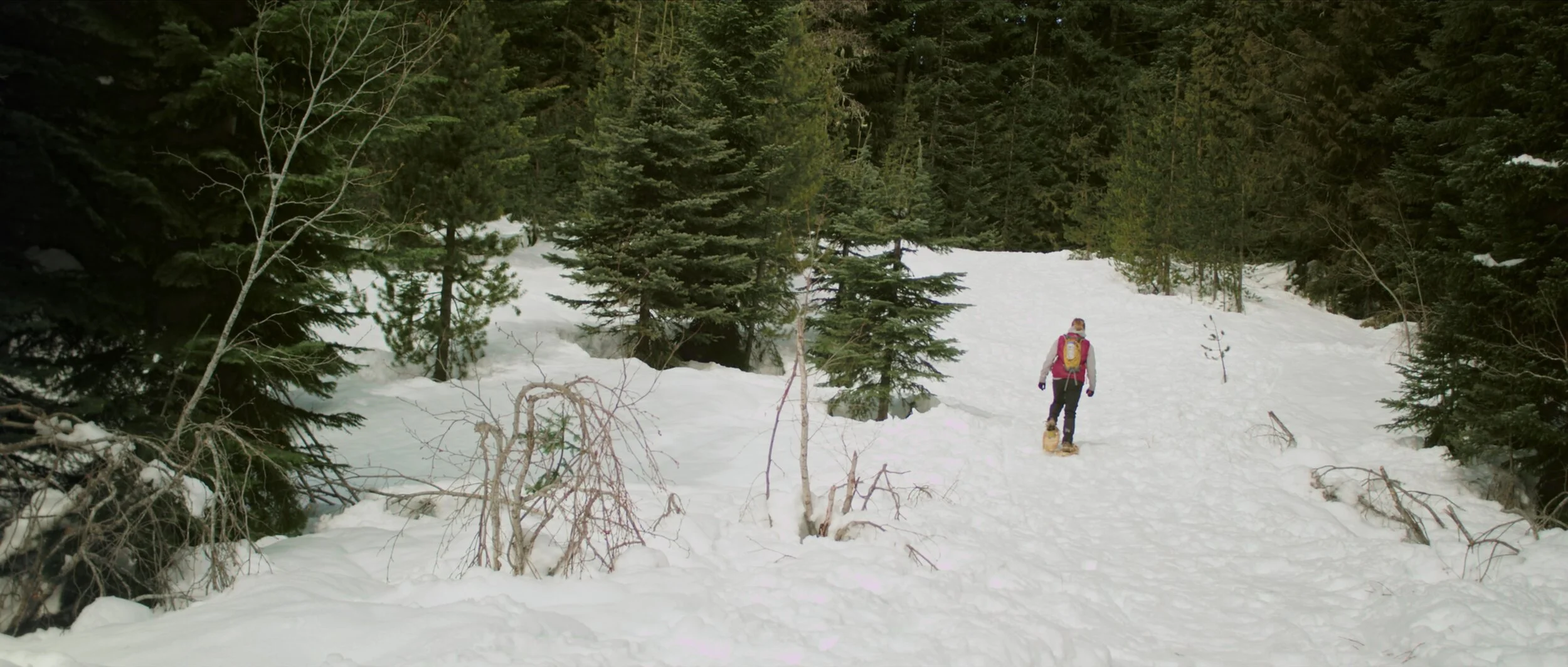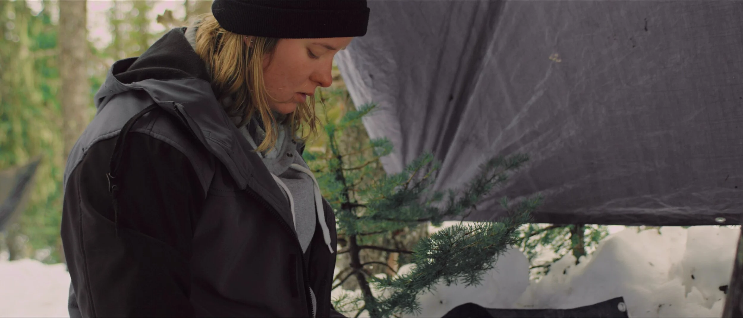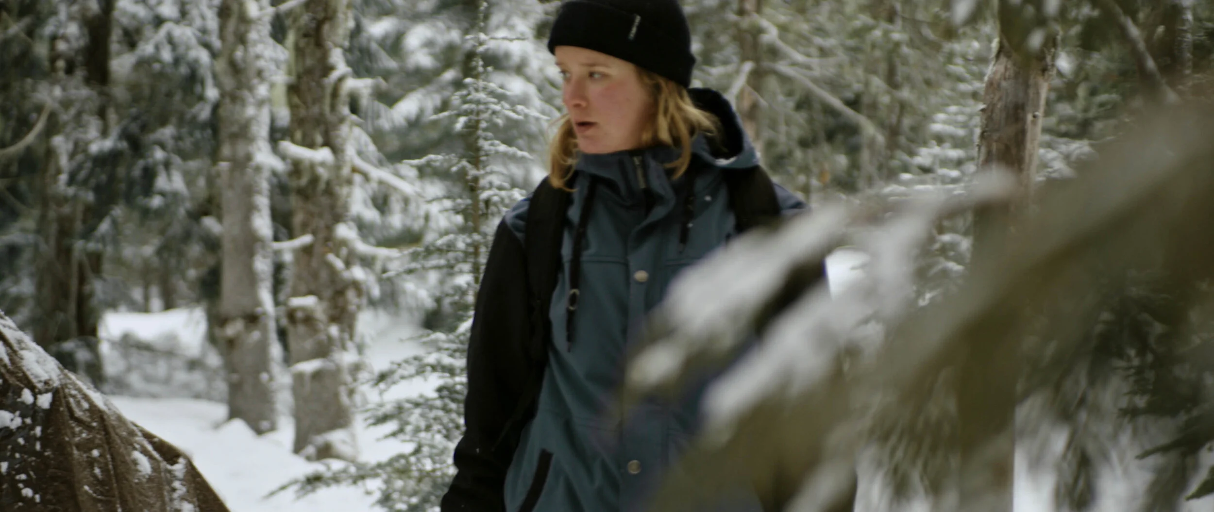 Tenacious, 19 year-old Sadie Ford operates within the poetic persona of a searching pioneer. Her footsteps track over the town of Government Camp’s mountain landscape, her dog Scooter her only constant companion. Deep among the Douglas firs Sadie snowshoes to build her nestled tentsite, a place she feels more at ease than anywhere with four walls. Riding sessions and house parties in town provide breaths of social interaction and connection, but otherwise she chooses to spend time in solitude. Sadie’s simple quest for joy is tempered by melancholy when increasingly warm temperatures on the mountain cause rain to replace snow, and the winter season grows shorter. Striking a youthful yet elegiac tone, WOODSRIDER is a meditative film about identity, home, and the way that human experience echoes that of the natural world.
